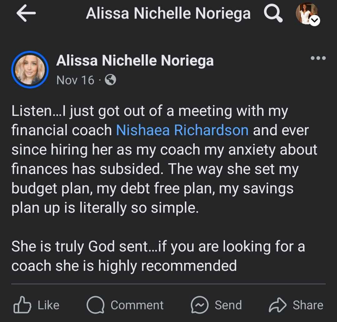 Hey! I'm Nishaea Richardson, a financial coach with 3+ years of experience under my belt and a passion for helping others build a healthier relationship with their money.